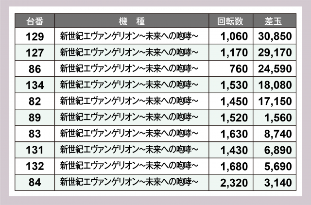 続いてはパチンコをチェック。『eフィーバーからくりサーカス2 魔王ver.』は167番台の+95,700発弱を筆頭に重量級の出玉がズラリ。さらにベテランマシンの『新世紀エヴァンゲリオン〜未来への咆哮〜』にも好記録が続出。
