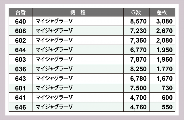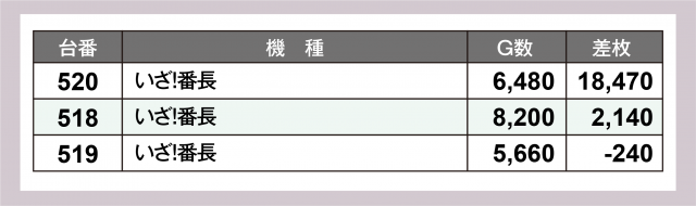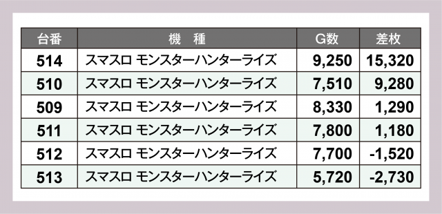 20円パチスロでは『いざ!番長』にコンプリート機能が発動する大台突破台が生まれ、『スマスロ モンスターハンターライズ』でも万枚オーバー台を計上しハイクオリティが窺えた。また『マイジャグラーⅤ』も上位10台が安定した成果を残した。