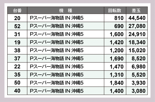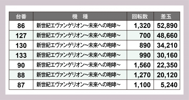 一方4円パチンコでは『新世紀エヴァンゲリオン〜未来への咆哮〜』は86番台の+53,000個弱を含めて6台が5桁プラス。さらに定番マシンの『Pスーパー海物語 IN 沖縄5』では20番台が+45,000個弱と、最新スマパチに引けを取らない大量獲得が見受けられた。