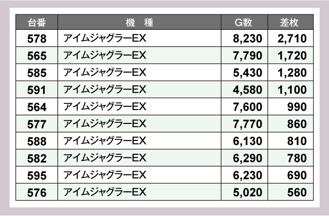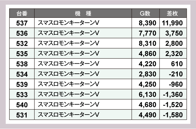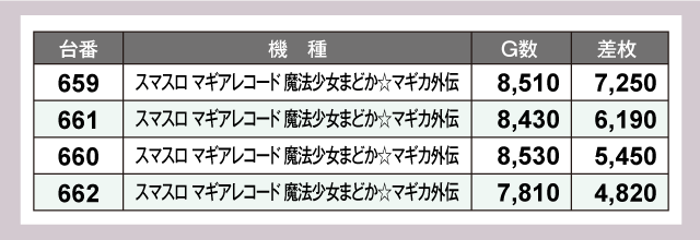 パチスロコーナーで最も目立っていたのが『スマスロ マギアレコード 魔法少女まどか☆マギカ外伝』で、659番台の+7,250枚を筆頭に全台がプラス差枚となる見事な結果を残している。また、『スマスロモンキーターンV』からは+11,990枚が発生。そして、『アイムジャグラーEX』からも多数の好調台を確認できた。