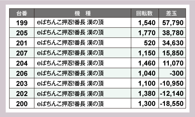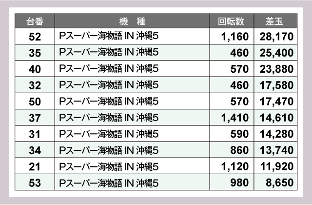 一方、パチンココーナーでは『eぱちんこ押忍!番長 漢の頂』が絶好調で、199番台の+57,790発をはじめ+30,000発超が2台も飛び出している。さらに人気の『Pスーパー海物語 IN 沖縄5』も万発超が6台に+20,000発超が3台という盛況ぶりを見せており、両シマは終日活気とファンの笑顔に包まれていた。