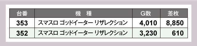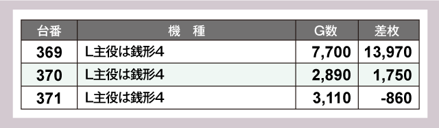そんな中、最もプレイヤーの注目を集めたのが『L主役は銭形4』で、369番台が怒涛の+13,970枚を叩き出していた。さらに、『スマスロ ゴッドイーター リザレクション』からは+8,850枚が出現、『スマスロモンキーターンV』は全6台中4台がプラス差枚で終了する好成績を残している。