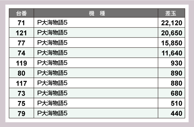 また、パチンココーナーで目立っていたのが『P大海物語5』で、半数以上の台がプラス差玉で終了する中、71番台と121番台が+20,000発超を記録しているだけにシマ内は常に活気とファンの笑顔で溢れていた。