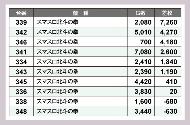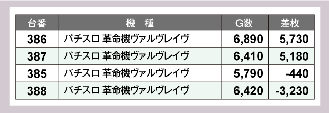 まず、パチスロコーナーでプレイヤーの注目を集めたのが『スマスロ北斗の拳』で、339番台の+7,260枚を皮切りに半数以上の台がプラス差枚で終了する見事な結果を残している。また、いまだ人気が衰えぬ『パチスロ 革命機ヴァルヴレイヴ』からは+5,000枚超が2台も発生する盛況ぶりを見せていた。