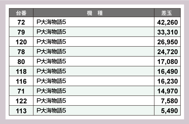一方のパチンココーナーは『P大海物語5』から万発超が大量発生!! なかでも72番台が+42,260発、79番台が+33,310発を叩き出す驚異の記録を残しているだけに、シマ内は常に活気とファンの笑顔で溢れていた。