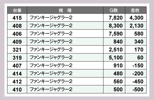 ノーマルタイプからピックアップするのは『ファンキージャグラー2』。高稼働をマークした台も多い中、415番台の+4,300枚を始め6台がプラスという結果を残した。