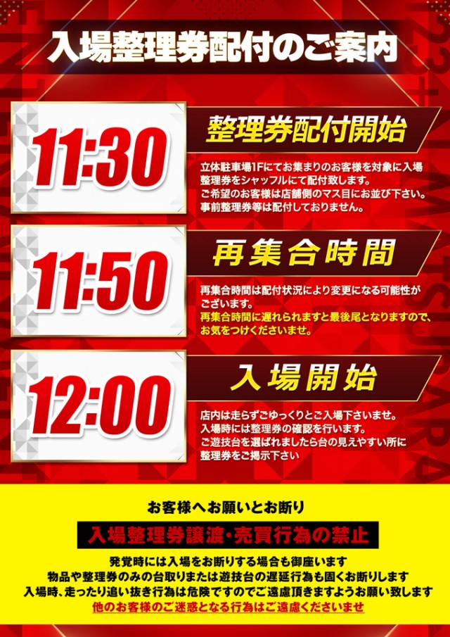 AM9:30より立体駐車場1Fにて配付 新台入替日はオープン時間変更あり |