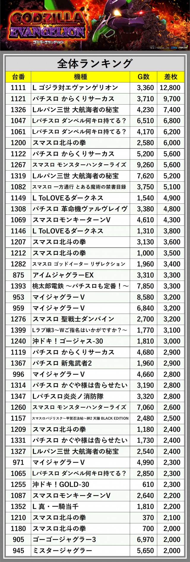 厳選された取材対象機種をはじめ、その他スロット全体から好記録が飛び出した!プレイヤーが楽しんだ1日を下記データにて振り返ってみて欲しい。