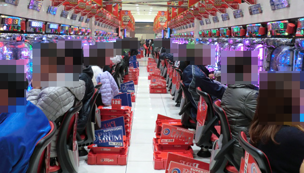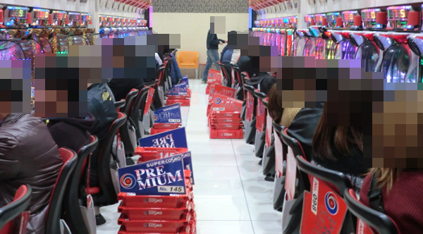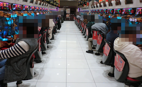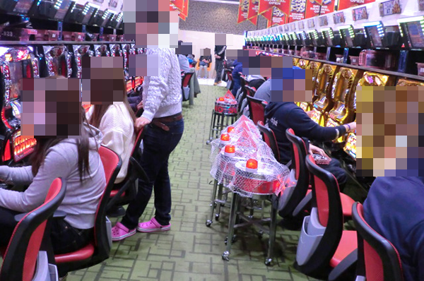 14時を過ぎる頃になると、4円パチンコの「CR牙狼 魔戒ノ花」がひときわ盛り上がっており、ほぼ満席。シマ内には、楽しめていないプレイヤーのほうが少なく思えるほどに魅力的な光景が広がっていた。