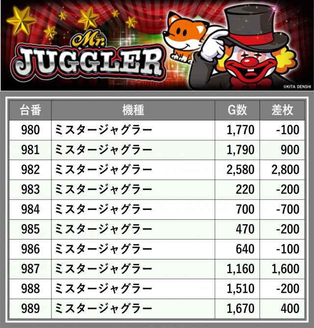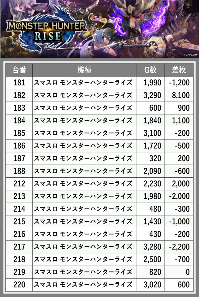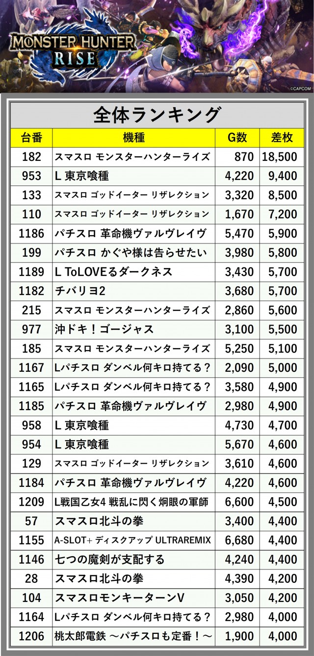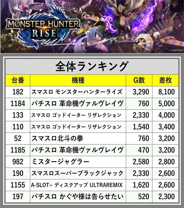 厳選された取材対象機種をはじめ、その他スロット全体から好記録が飛び出した!プレイヤーが楽しんだ1日を下記データにて振り返ってみて欲しい。