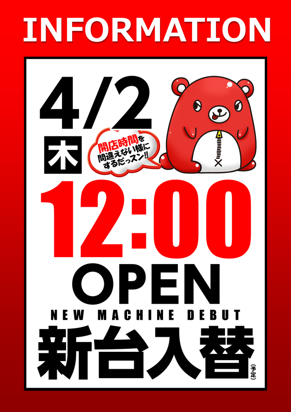 明日2日(水) 新台入替【初日】×マザーブロス!12時開店♪
