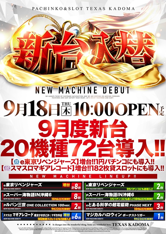 2025/09/179月18日【木】新台入替♪全館10時OPEN予定!!