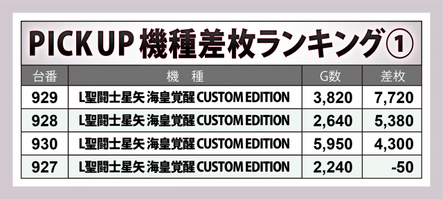 『ゴッドイーター』に負けず重量級の出玉が相次いだのが『L聖闘士星矢 海皇覚醒 CUSTOM EDITION』。+7,700枚超・+5,400枚弱・+4,300枚超が1台ずつと並んだ。