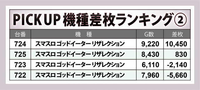 全360台の頂点に輝いたのが『スマスロ ゴッドイーター リザレクション』724番台で、+10,500枚弱と華々しい数字を刻んだ。