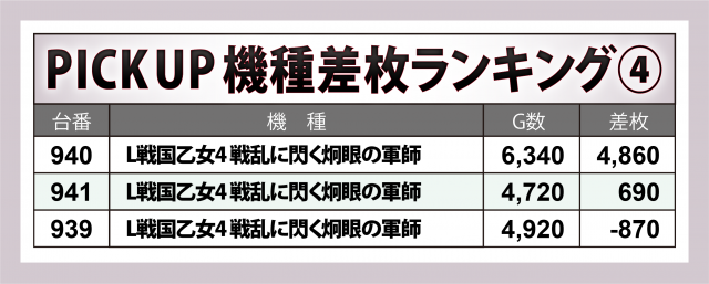 加えて『パチスロ甲鉄城のカバネリ』では+5,500枚超・+3,400枚超が1台ずつ、『L戦国乙女4 戦乱に閃く炯眼の軍師』の+4,900枚弱、『パチスロ かぐや様は告らせたい』の+4,100枚超と、好成績が続き、その他の機種でもプラス台比率の高さが目立った。
