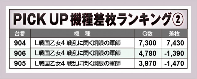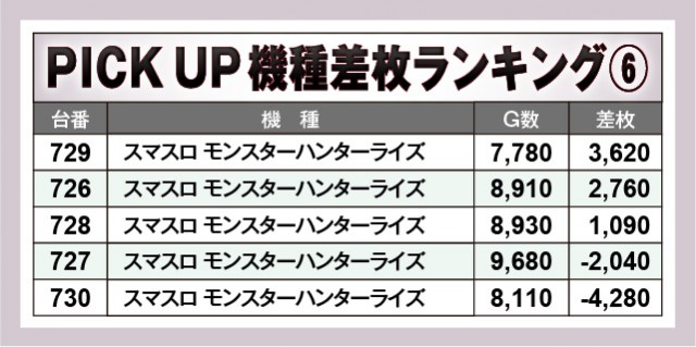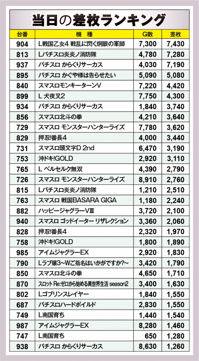 上表に名を連ねた優秀機種は、いずれも高い活気と熱気を披露していたのが特徴的だ。その中で『スマスロ モンスターハンターライズ』はひと際存在感を放っており、遊技するファンも好感触を得ては、時間の許す限りレバーを叩いていた。もちろん7,000枚OVERを達成した『Lパチスロ炎炎ノ消防隊』『L戦国乙女4 戦乱に閃く炯眼の軍師』『パチスロ からくりサーカス』も秀でており、ファンは満足度の高い1日を過ごせたことだろう。