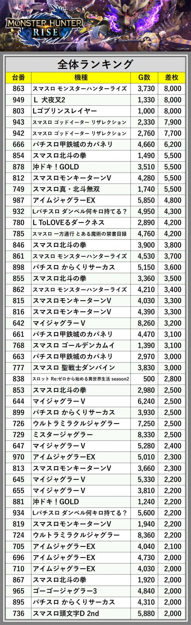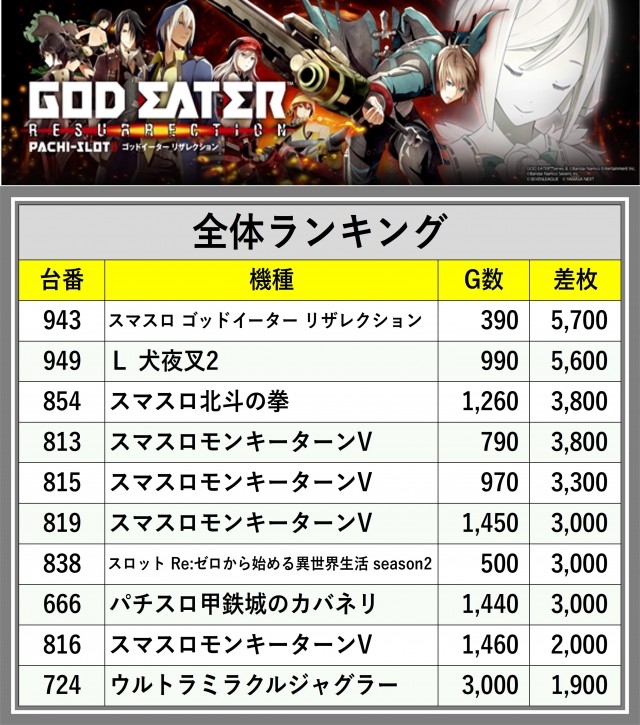 ※差枚数順に掲載しています