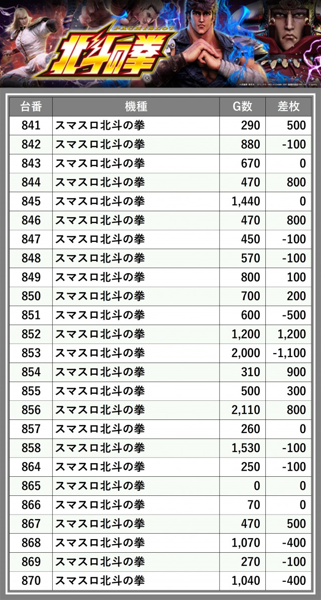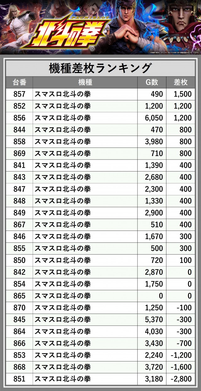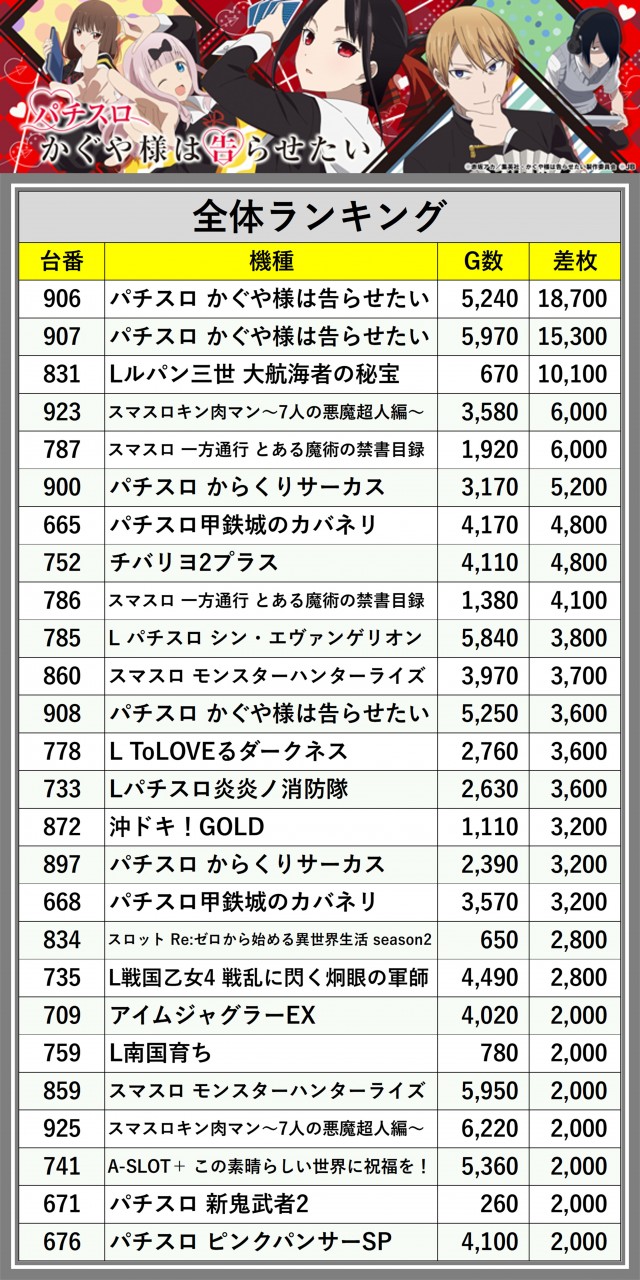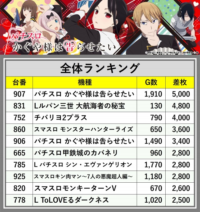 ※差枚数順に掲載しています