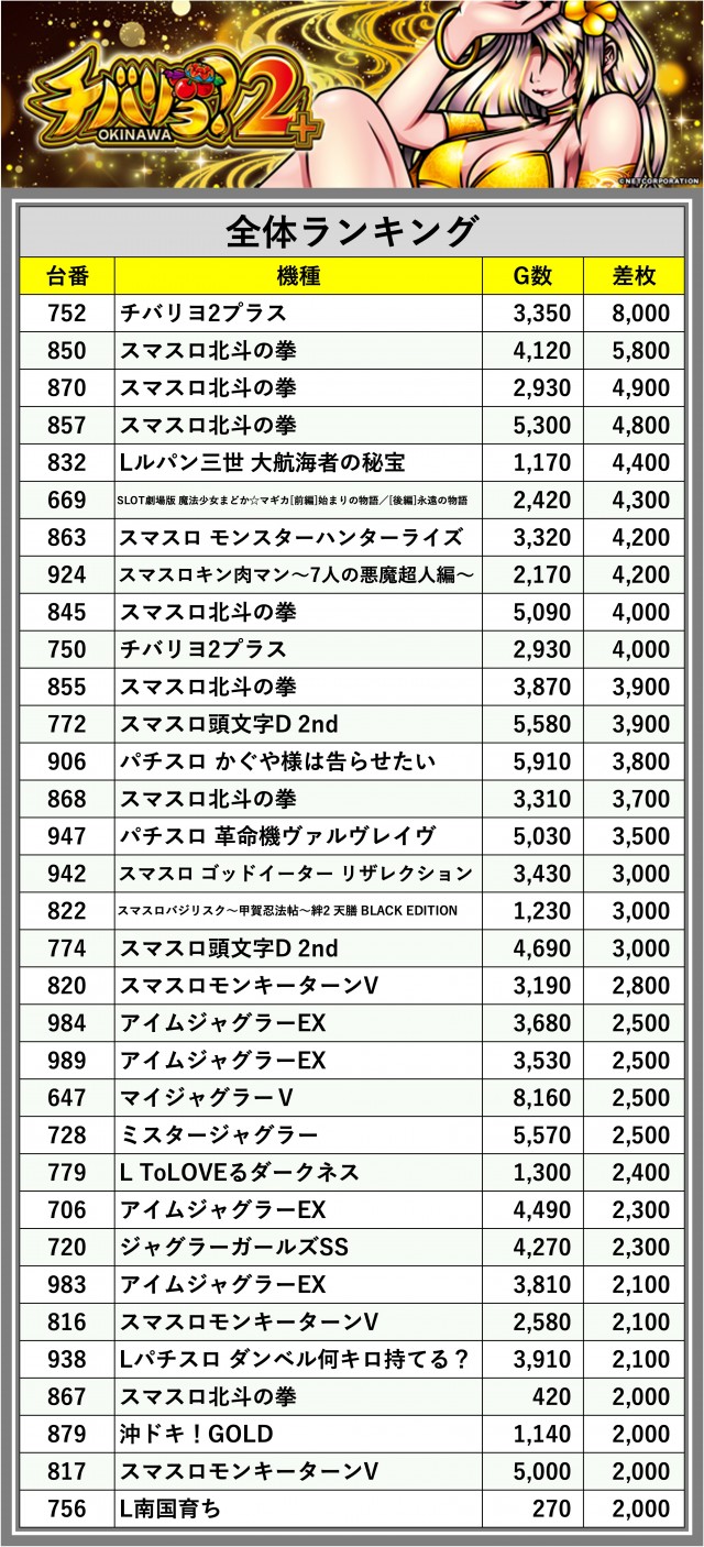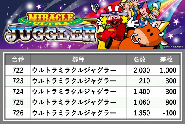厳選された取材対象機種をはじめ、その他スロット全体から好記録が飛び出した!プレイヤーが楽しんだ1日を下記データにて振り返ってみて欲しい。