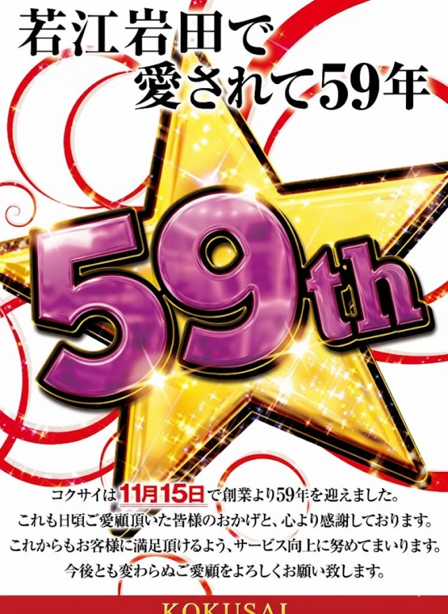 お陰様で🌈59周年🌈明日15日は必ずコクサイヘ!