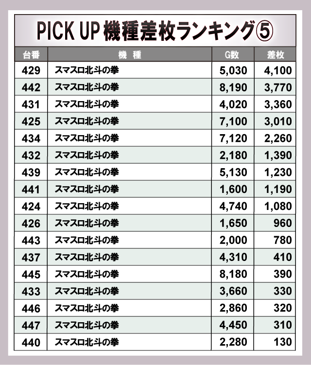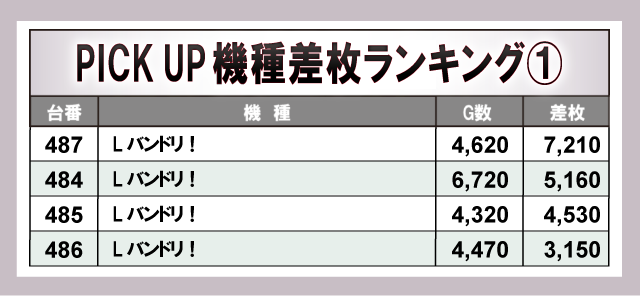 今回の差枚ランキングTOPは『L戦国乙女4 戦乱に閃く炯眼の軍師』の+10,820枚!そして、やはり今回も強かったのは、毎度まとまった出玉を獲得している台が複数存在する『スマスロ北斗の拳』。次点で『Lバンドリ!』が挙げられる。差枚ランキングのほぼ全ての台が+3,000枚OVERとなっており、今回もしっかりとその実力の高さを見せつける結果になったと言えるだろう。次回も我々の期待を超えてくれるのか…引き続き要注目だ!