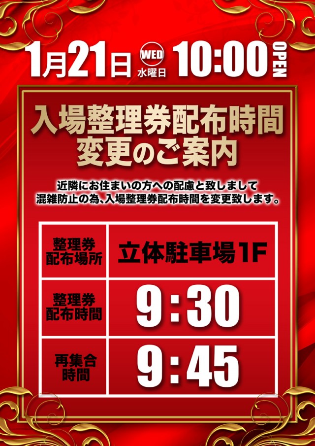 9時45分より整理券配布・抽選開始。※日により変更となる場合がございます。 |