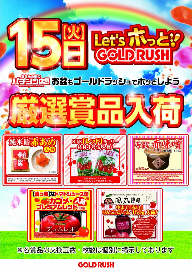 お盆もゴールドラッシュでホッとしよう14日(月)~の週は休まず営業いたします。++++++++++++++++++++総付景品進呈