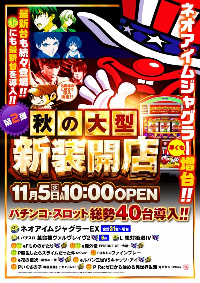 ⚡明日5日 新装開店⚡ネオアイムジャグラー増台&最新台導入