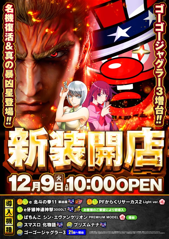 9日(火) 新装開店 暴凶星4&1円P導入×ゴージャグ増台!