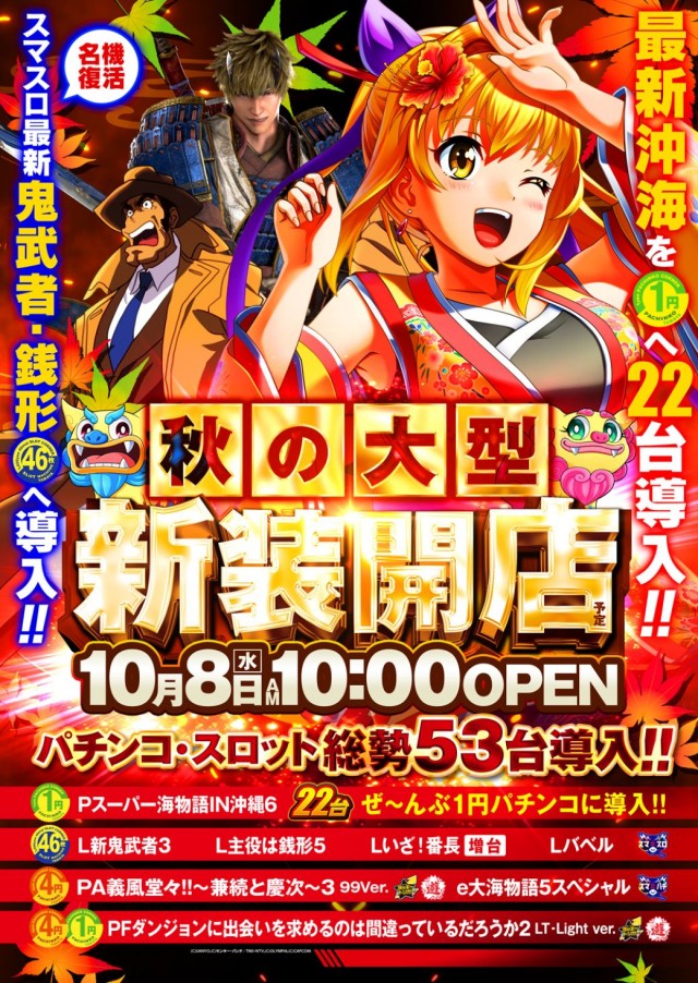 ⚡明日8日 新装開店⚡最新沖海6、鬼武者、銭形導入!