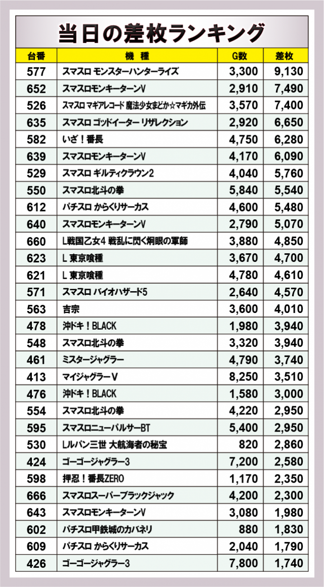 『スマスロ モンスターハンターライズ』の+9,130枚を筆頭に、『スマスロモンキーターンV』『スマスロ マギアレコード 魔法少女まどか☆マギカ外伝』『スマスロ ゴッドイーター リザレクション』『押忍!番長4』など、スマスロ機から6~7,000枚OVERの台が発生している!またメダル機も多数ランクインしていることから、多種多様にチャンスがあったことが窺える内容だ!