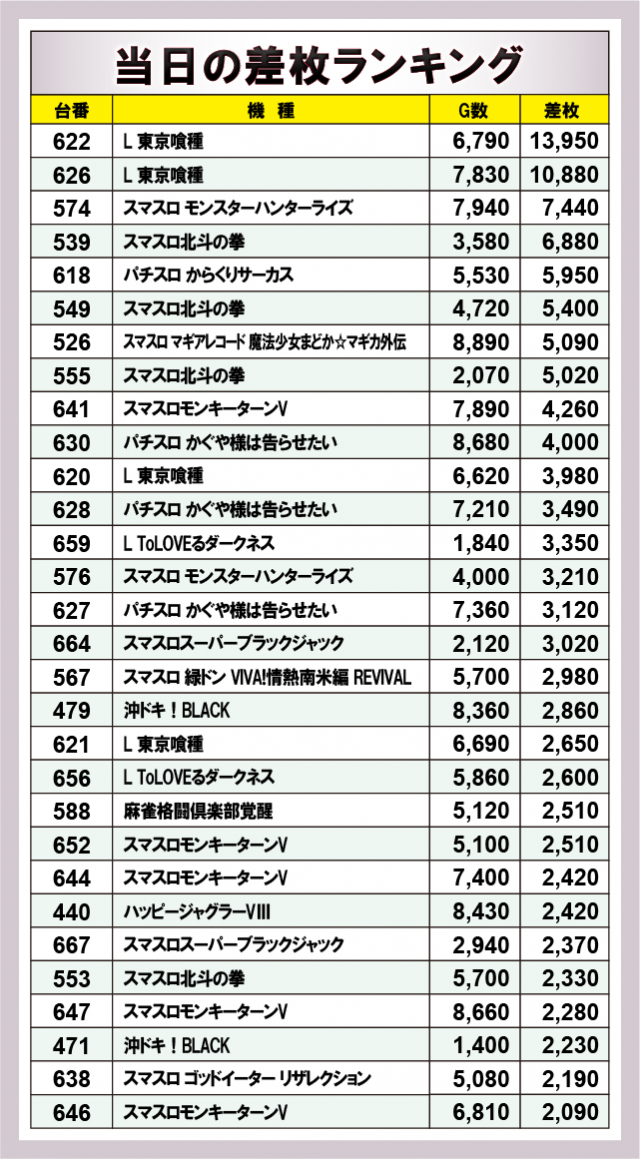 ※差枚数順に掲載しています。