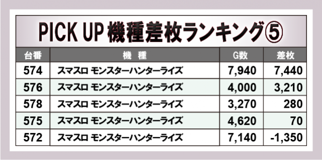 続いて注目機種を見ていこう。上述でも触れた『L 東京喰種』『スマスロ北斗の拳』『スマスロ モンスターハンターライズ』のほか、『スマスロモンキーターンV』『パチスロ かぐや様は告らせたい』もまとまった出玉を記録し、いずれも高いポテンシャルを秘めていたことが窺える。スマスロ人気機種から確かな手応えを感じることができ、同店の力強さをより一層実感する内容となっていた。