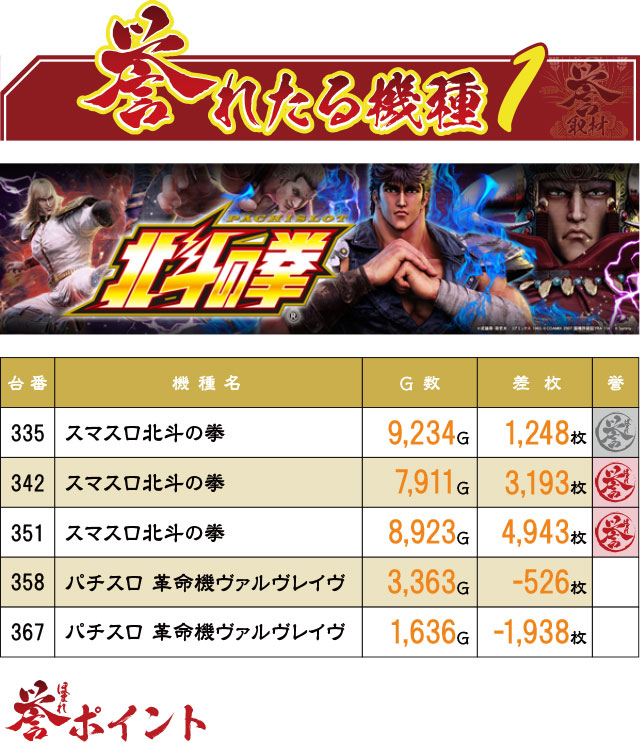 『スマスロ北斗の拳』から景気のいい大当りサウンドが響きまくっていたこの日、複数の誉マーキングが生まれることに。まるで『パチスロ 革命機ヴァルヴレイヴ』との格差を見せつけるかのように、プラス差枚が乱舞!