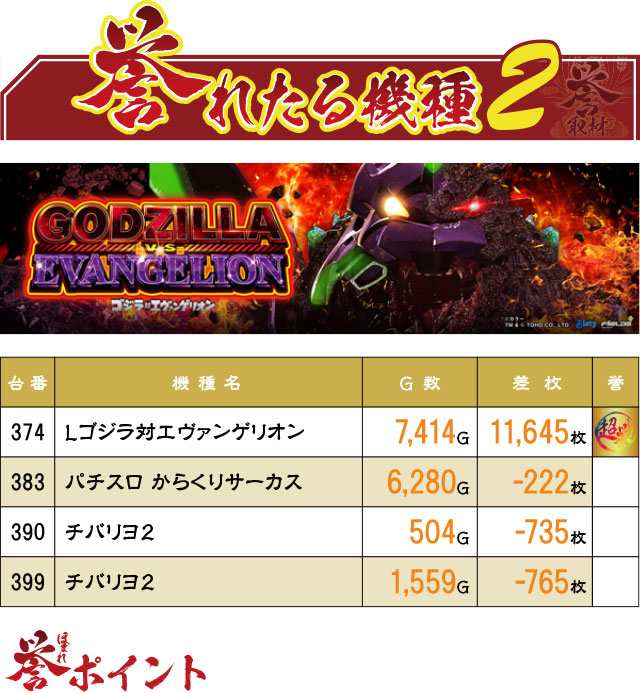 『Lゴジラ対エヴァンゲリオン』の374番台が暴れ回り、11,000枚超えを達成!さすがの勢いに、打っていた方も優秀台としての手応えを感じていたに違いない。