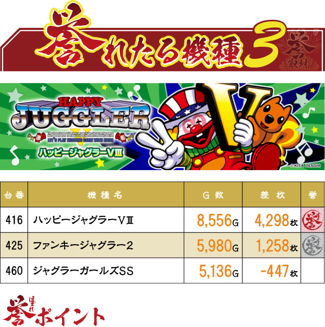 当然のように『ジャグラー』コーナーからも誉マークは生まれていた。中でもぱちタウン取材班が注目したのは、いとも容易く4,000枚超えをやってのけた『ハッピージャグラーⅤⅢ』の416番台!