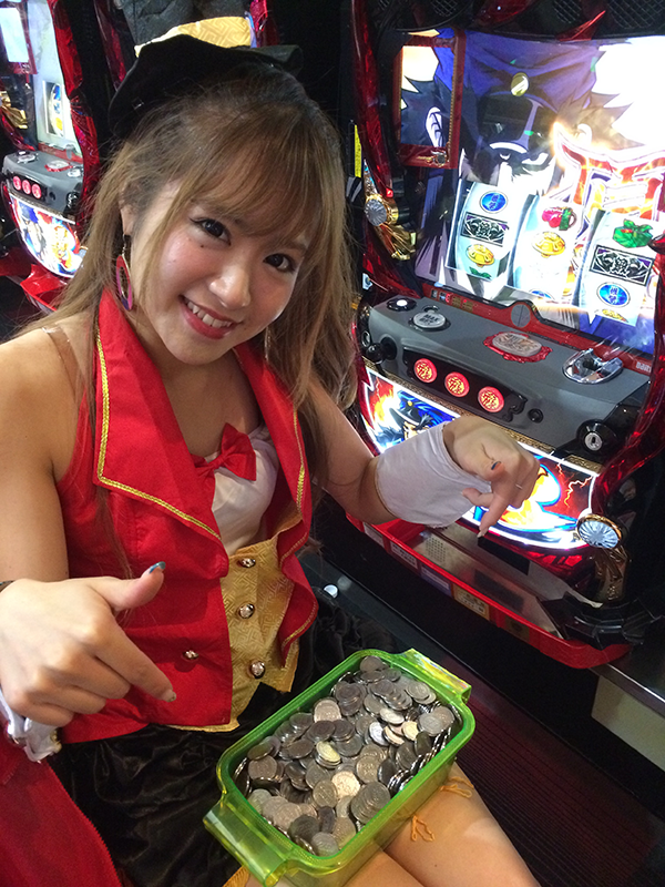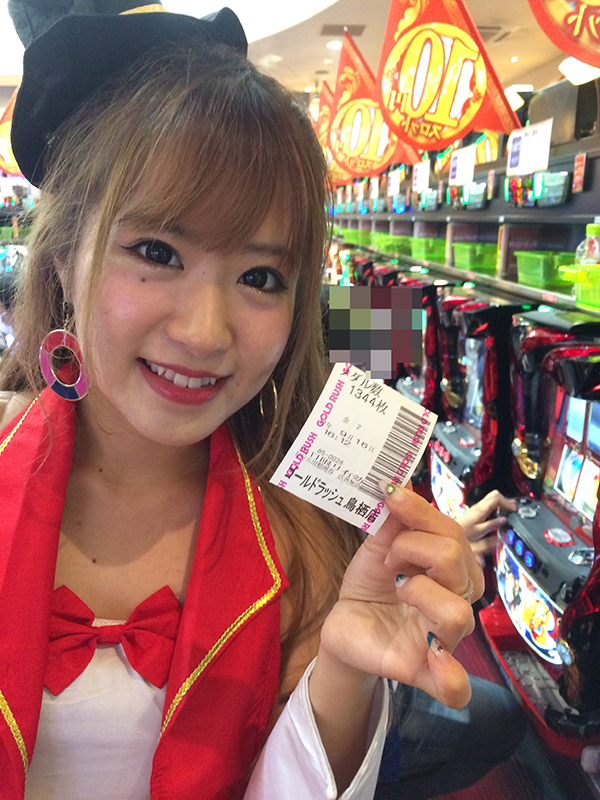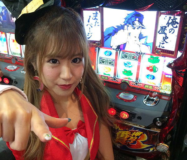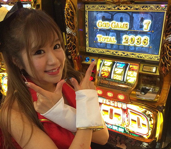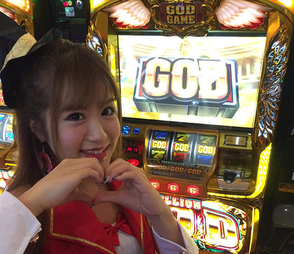さてさて、美月ちゃんが着席した機種は……ゴールドラッシュ鳥栖店でも人気の「ミリオンゴッド-神々の凱旋-」です!