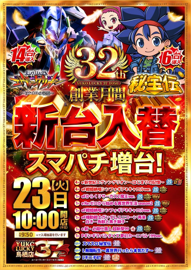 明日23日(火)新台入替!10時OPEN!
