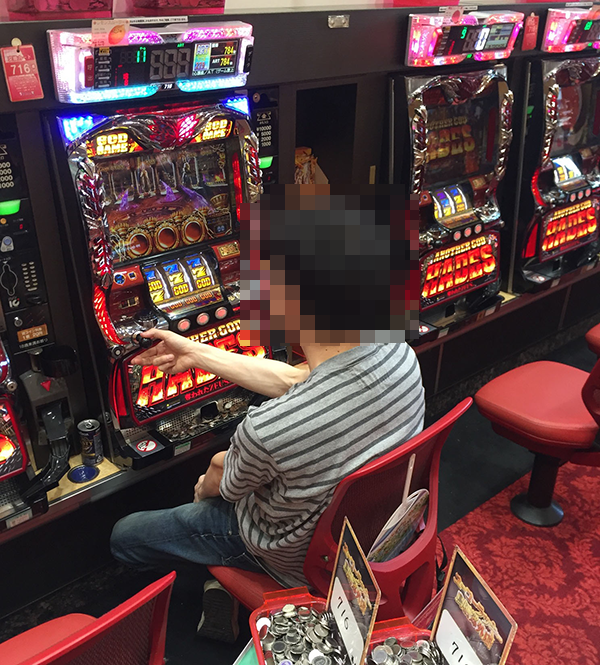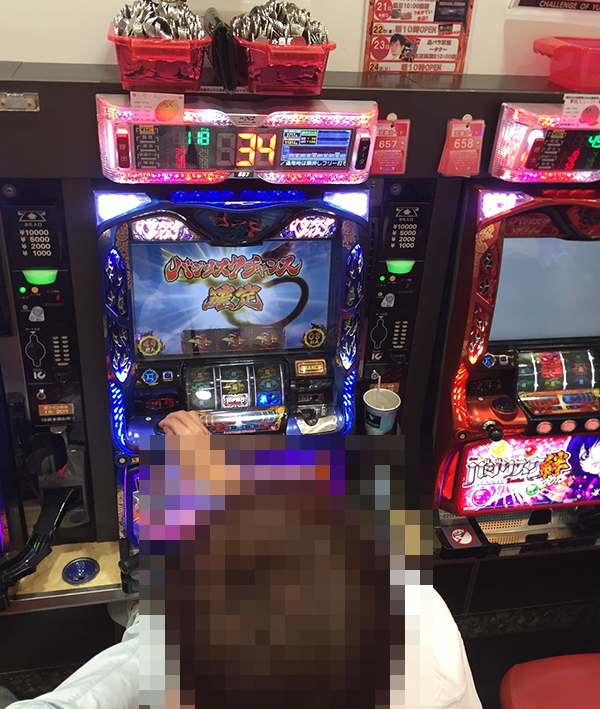 15時頃のパチスロでは、「バジリスク~甲賀忍法帖~絆」や「押忍!サラリーマン番長」に理想的ともいえる展開で遊技を楽しんでいるプレイヤーを発見。