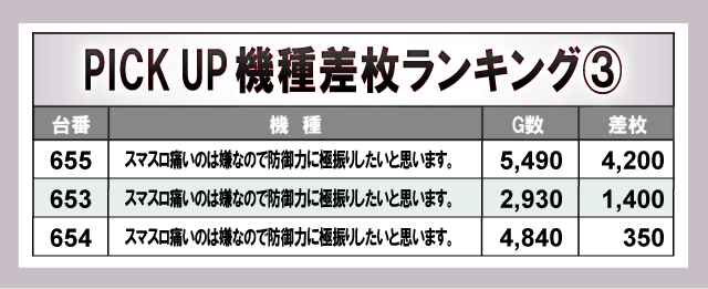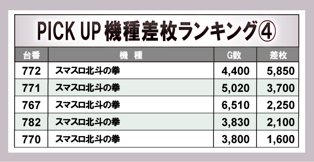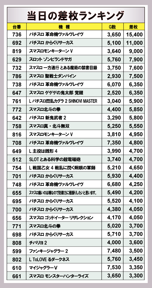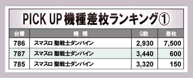 『スマスロ 聖戦士ダンバイン』から+7,000枚OVERが飛び出しており、凄まじい熱気を放っていた優秀機種である。また『マイジャグラーⅤ』は、終日を通して打ち込まれていたことから、まとまった出玉を確保する台が多かった。上表の4機種はいずれも大きなマイナスが見られず、ポテンシャルを秘めていた様子が窺える。