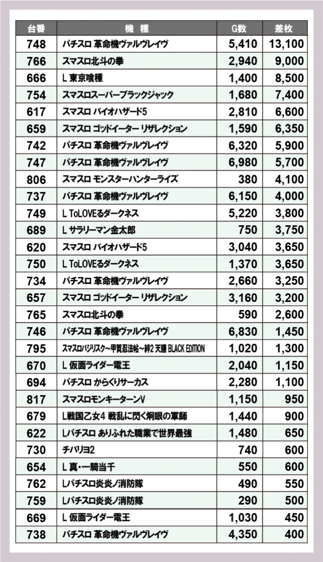 ※差枚数順に掲載しています
