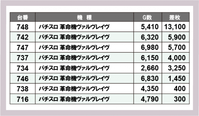 ヴァルヴレイヴ差枚ランキング