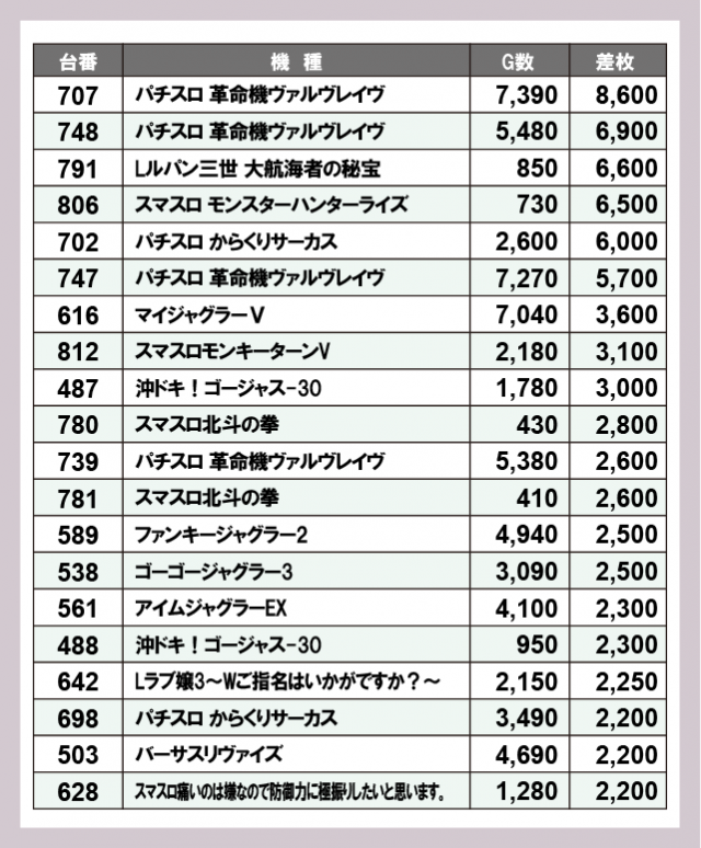 機種別差枚ランキング
