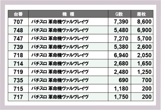 ※差枚数順に掲載しています