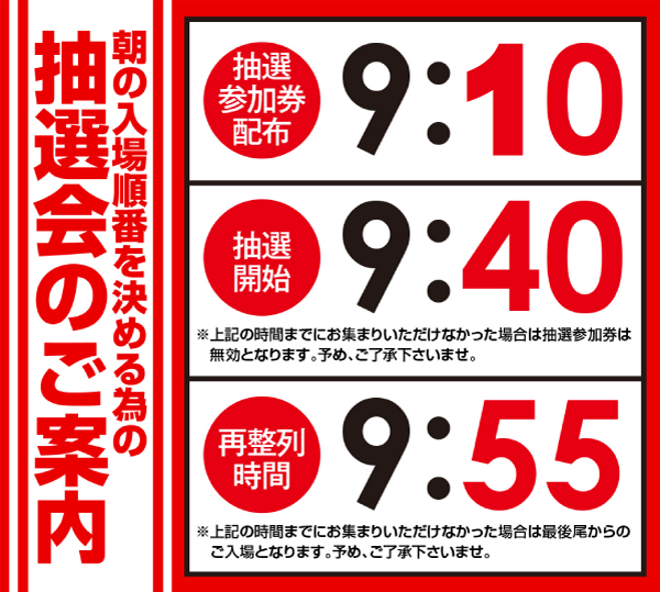 朝9時30分より抽選参加券を配布、9時40分に入場順番を決める抽選を開始します。再整列時間は9時55分です。 |