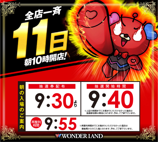 朝9時30分より抽選参加券を配布、9時40分に入場順番を決める抽選を開始します。再整列時間は9時55分です。 |