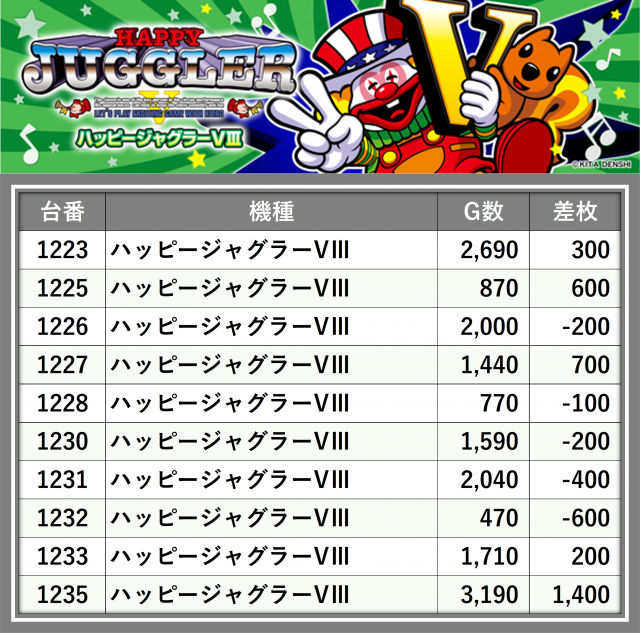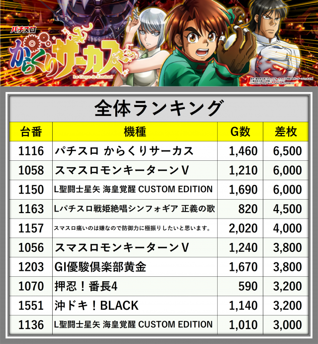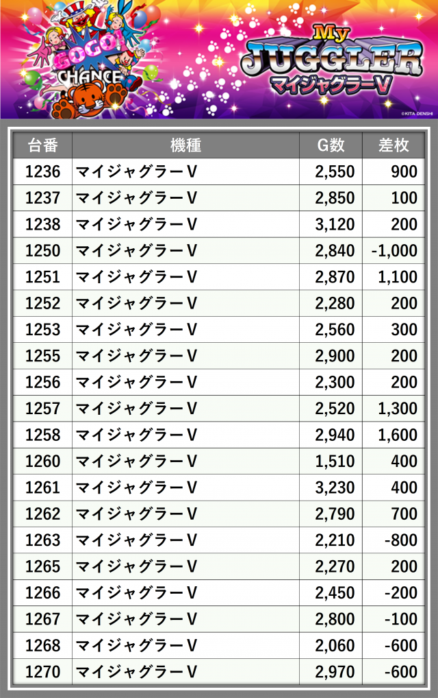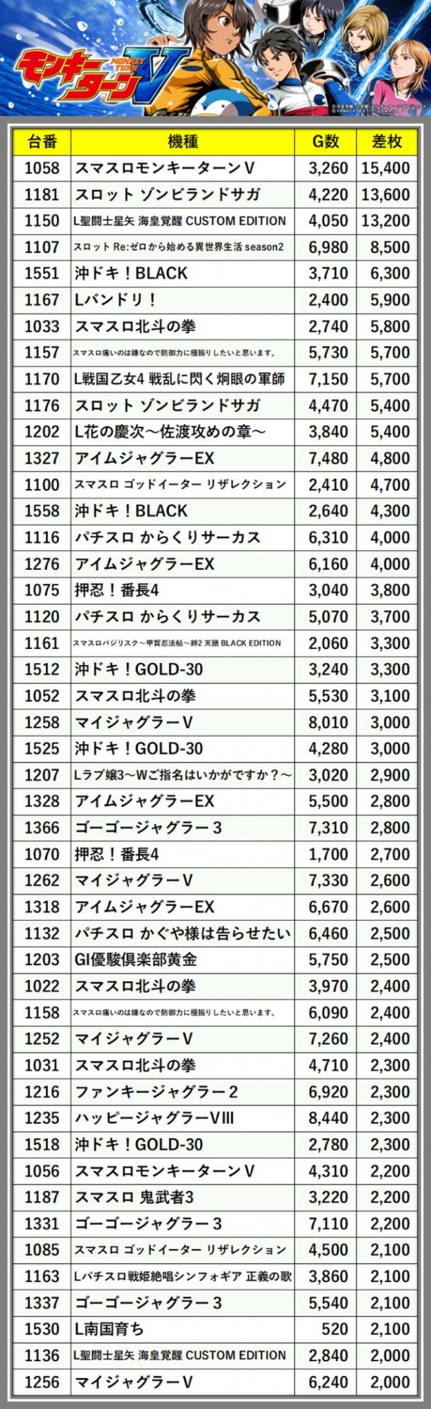 厳選された取材対象機種をはじめ、その他スロット全体から好記録が飛び出した!プレイヤーが楽しんだ1日を下記データにて振り返ってみて欲しい。