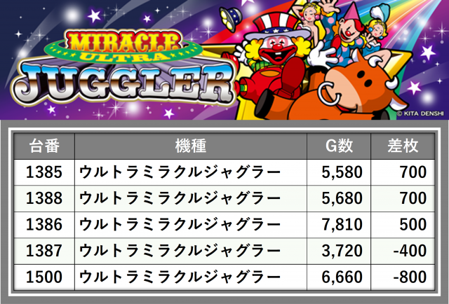 厳選された取材対象機種をはじめ、その他スロット全体から好記録が飛び出した!プレイヤーが楽しんだ1日を下記データにて振り返ってみて欲しい。
