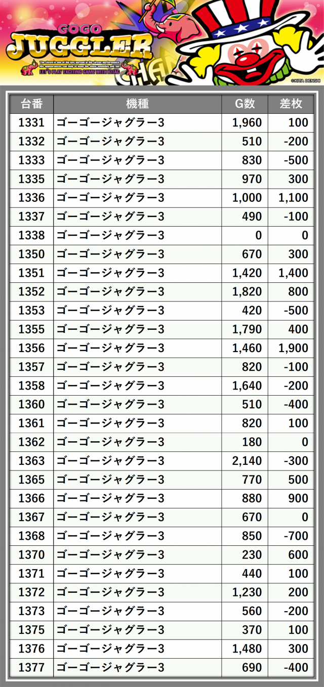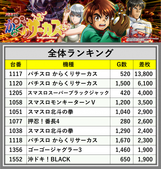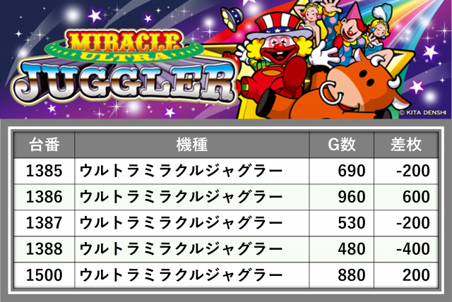 厳選された取材対象機種をはじめ、その他スロット全体から好記録が飛び出した!プレイヤーが楽しんだ1日を下記データにて振り返ってみて欲しい。
