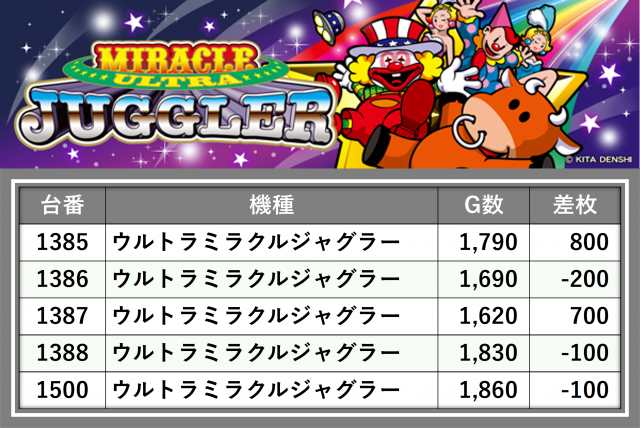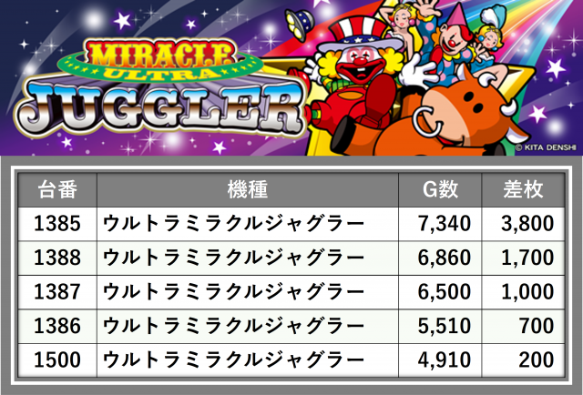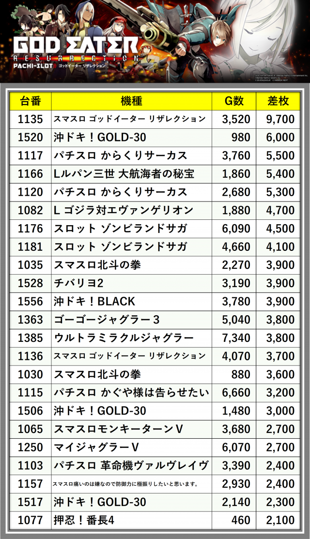 厳選された取材対象機種をはじめ、その他スロット全体から好記録が飛び出した!プレイヤーが楽しんだ1日を下記データにて振り返ってみて欲しい。